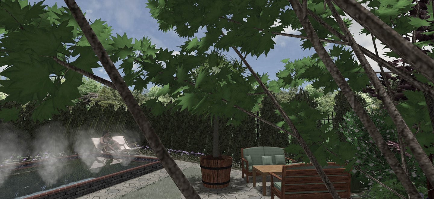The small garden, despite the large water layout, has gained in size, at the same time fulfilling dreams of quiet relaxation zones. A green enclave in the heart of the city allows you to feel like you're on vacation every evening.