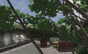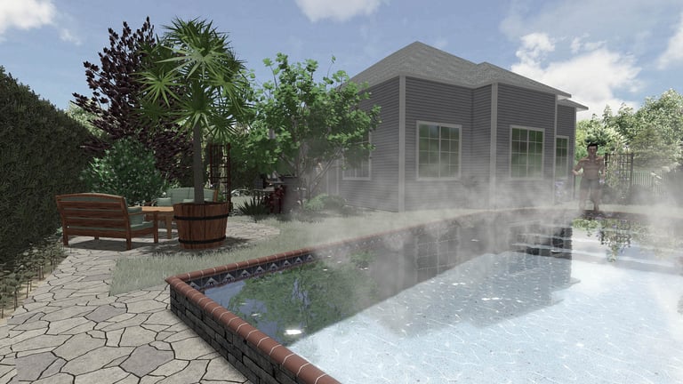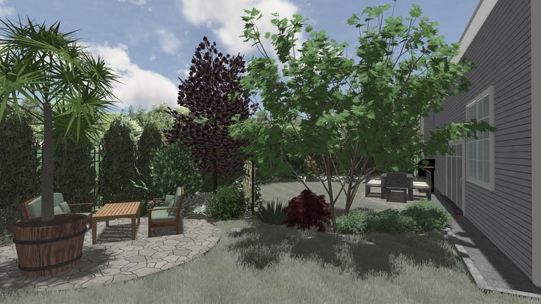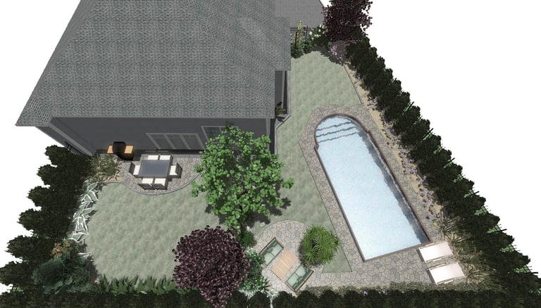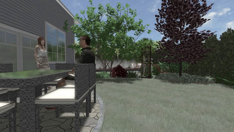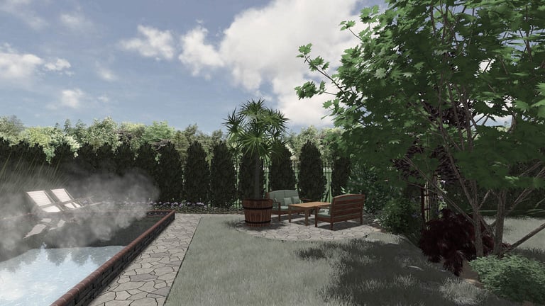 Additionally, the island makes it difficult to perceive the border hedge, creating the illusion of a much larger area.