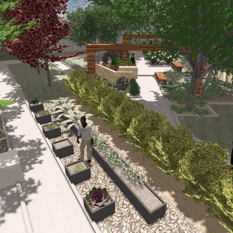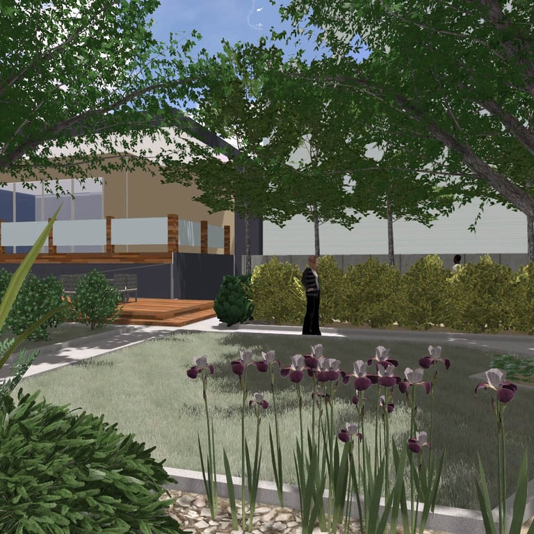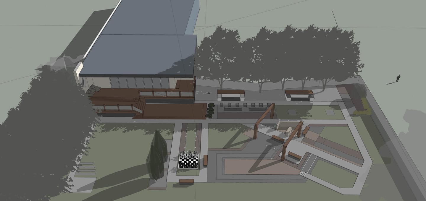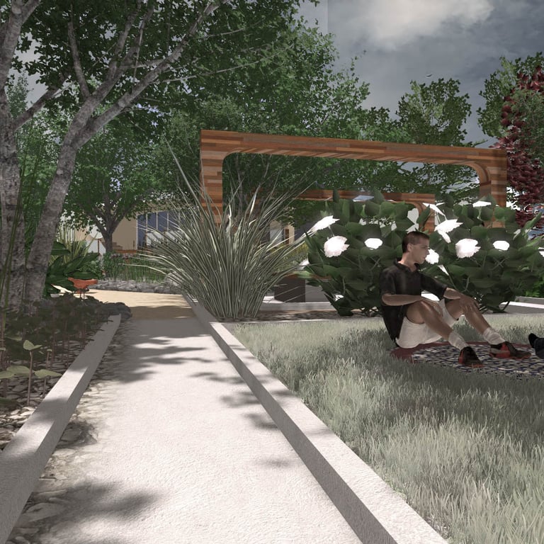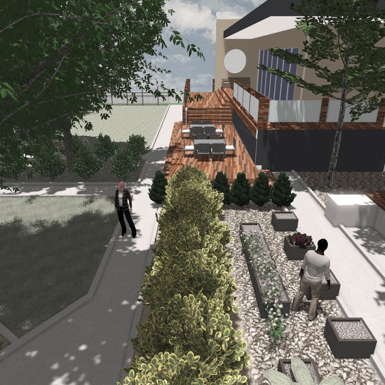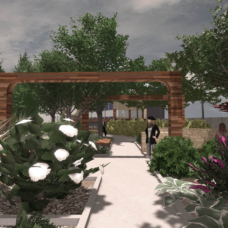 A small green park designed and implemented at a wedding restaurant organizing outdoor ceremonies.