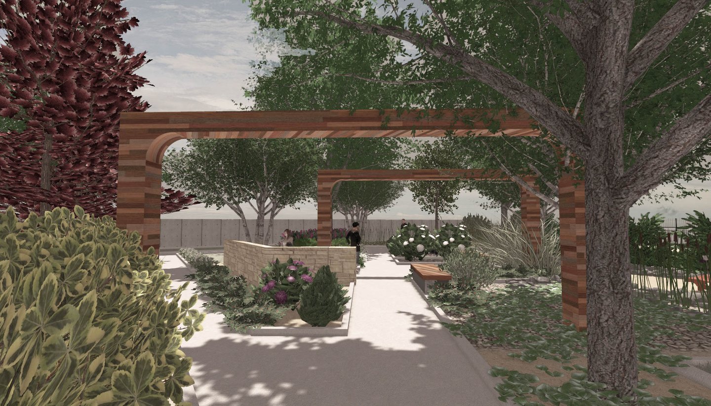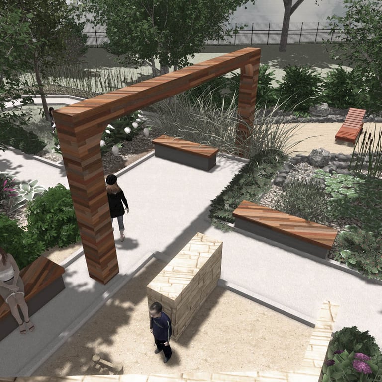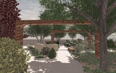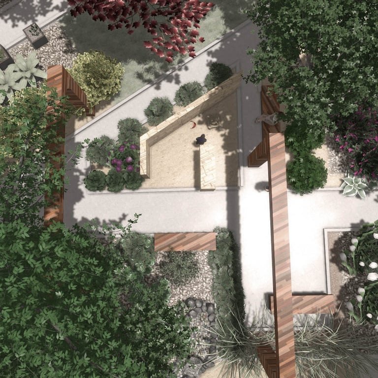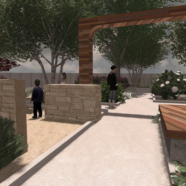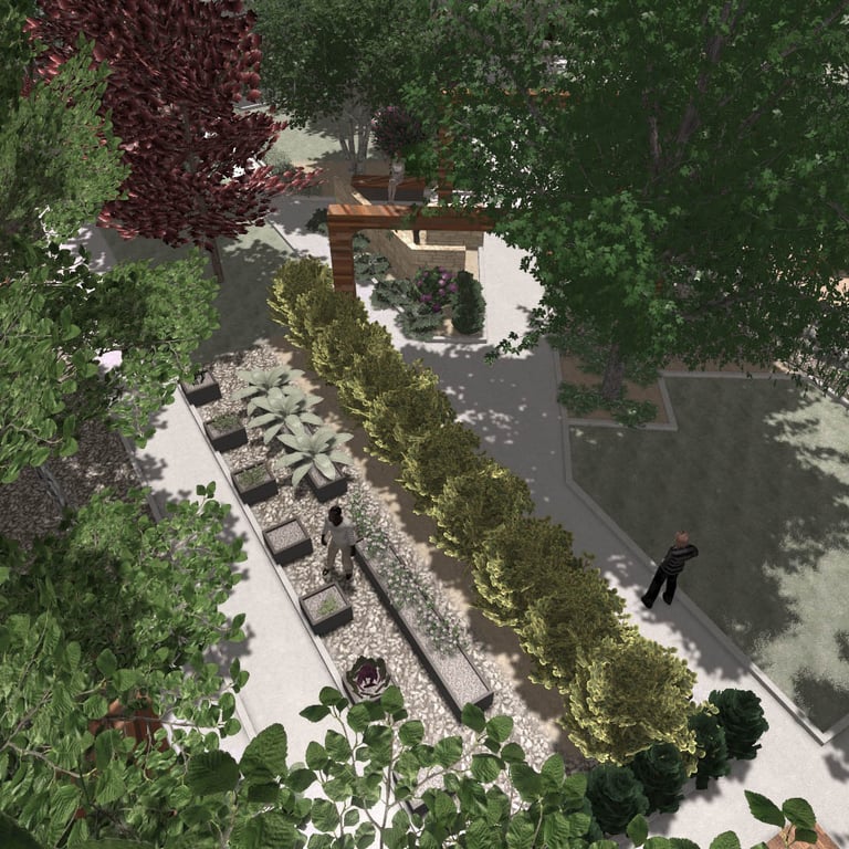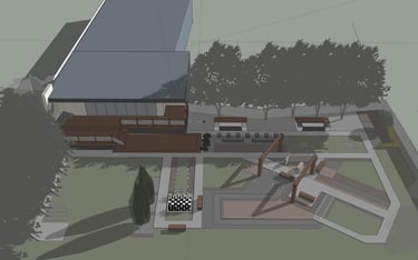 A small green park designed and implemented at a wedding restaurant organizing outdoor ceremonies.