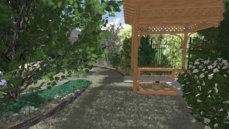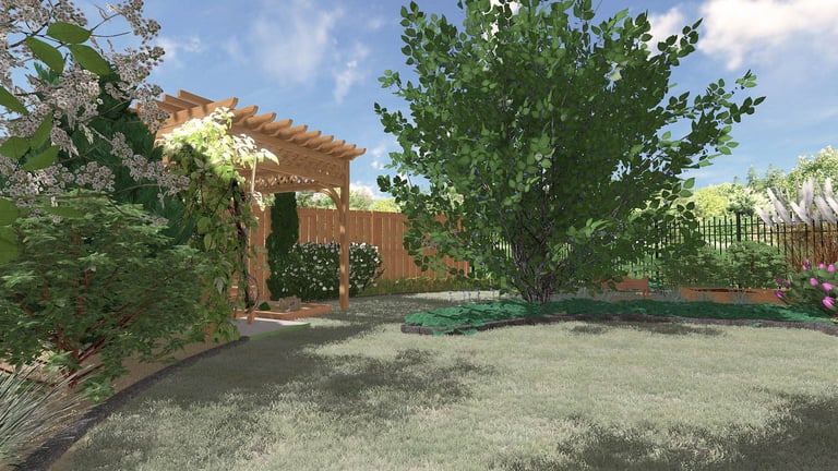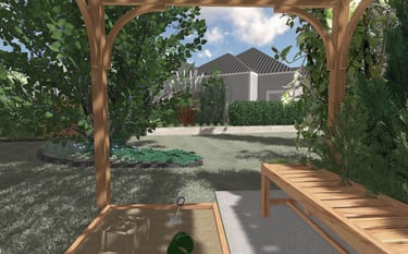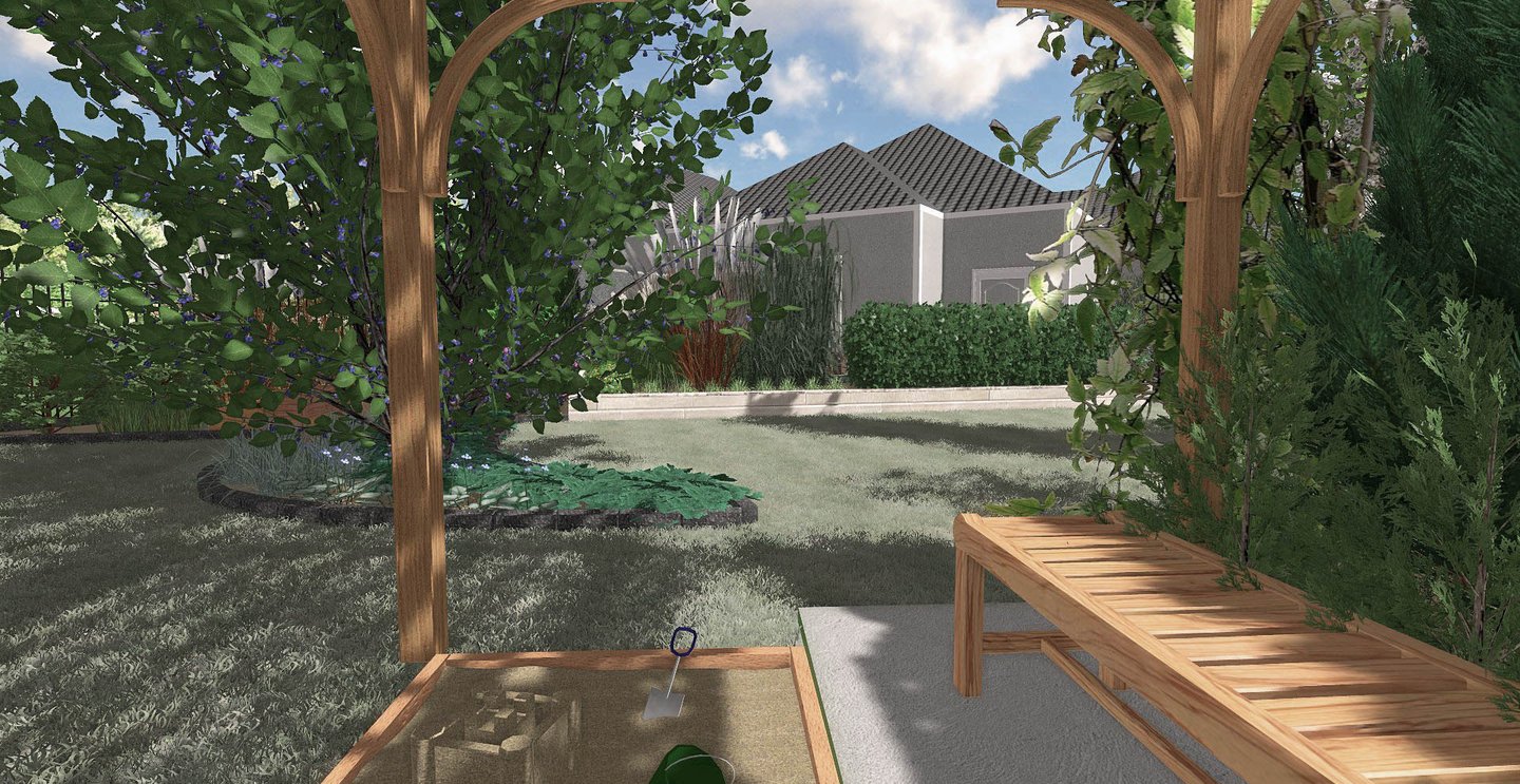 The pergola in the corner covers the sandbox or swimming pool in the summer.