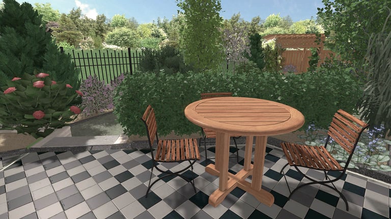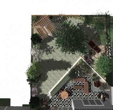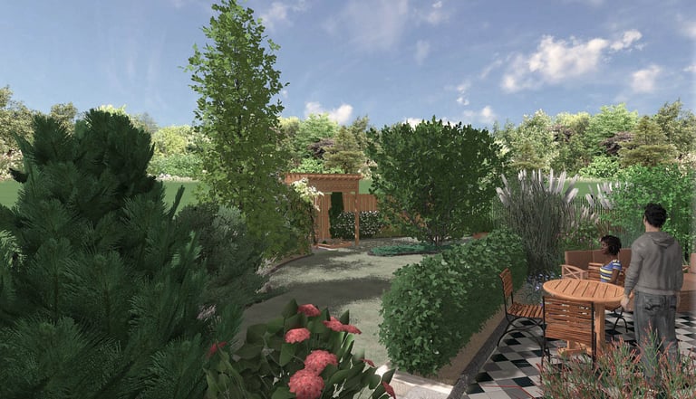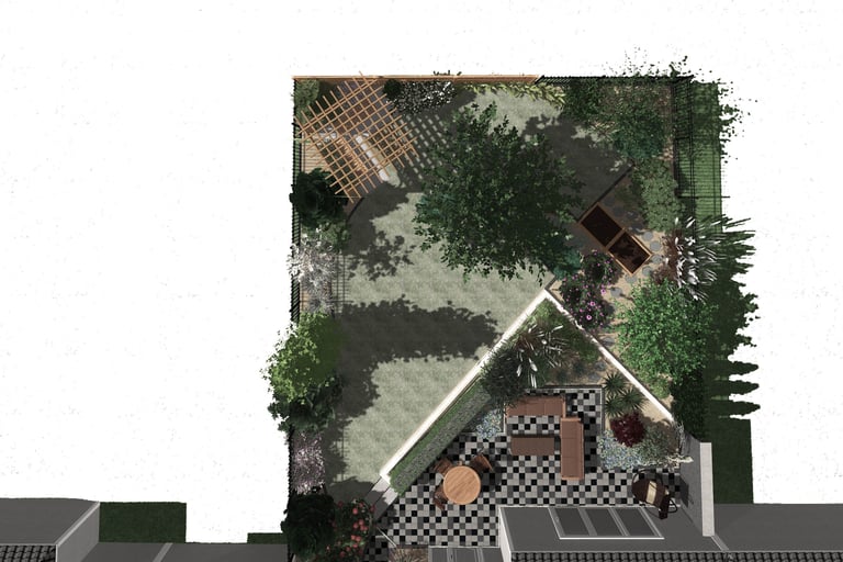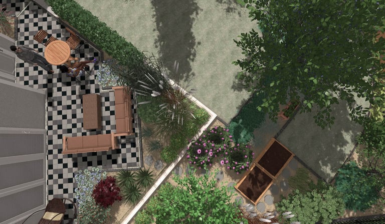 The other side of the terrace, surrounded by a gently sloping flowerbed, allows to create an adventure path for a three-year-old explorer, which leads to vegetable boxes and a mud kitchen.