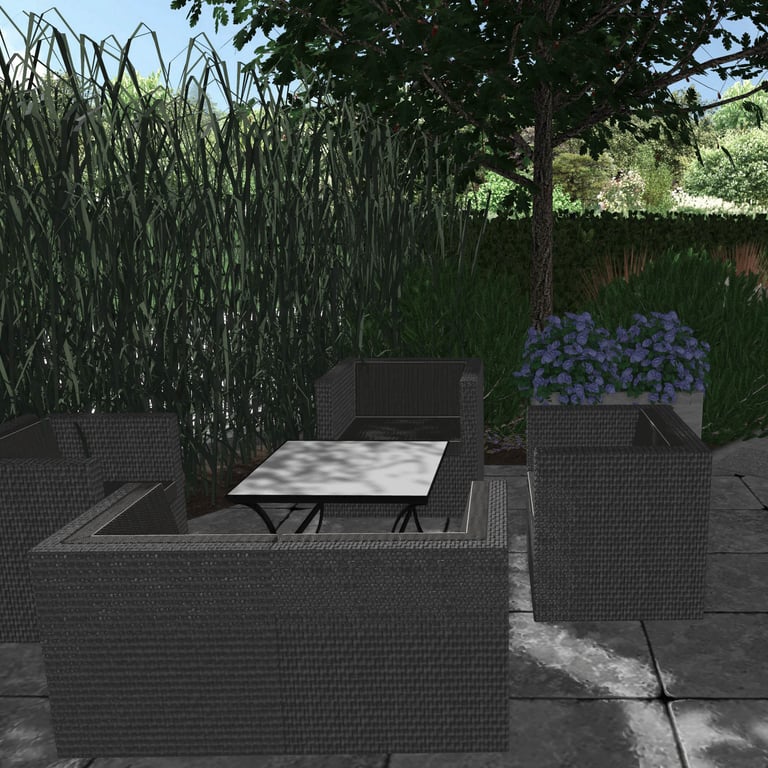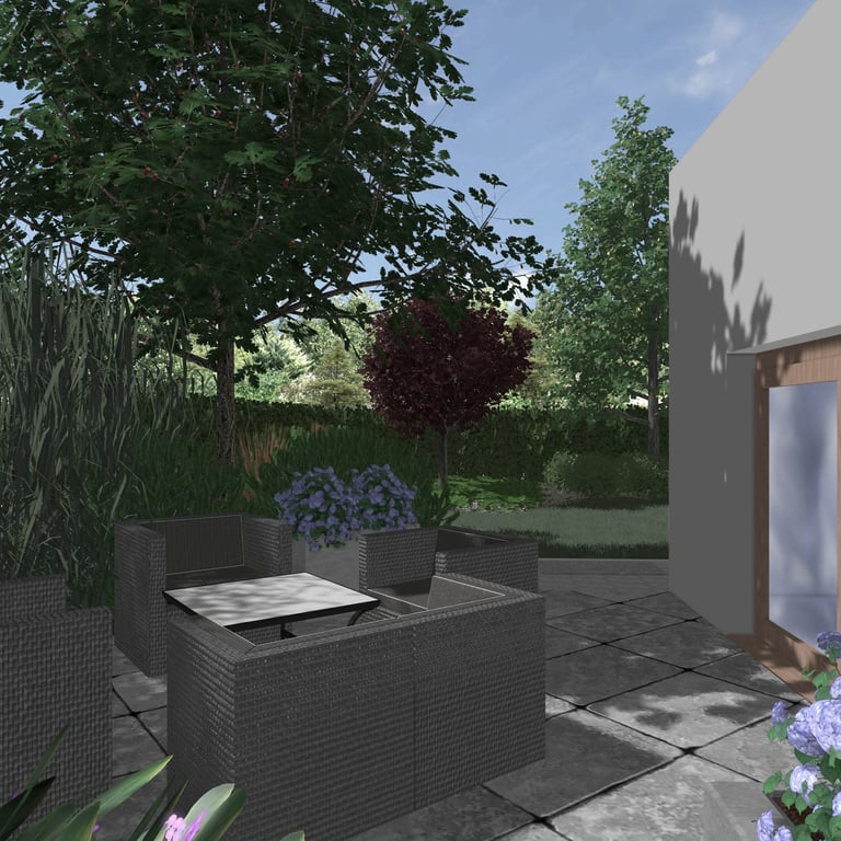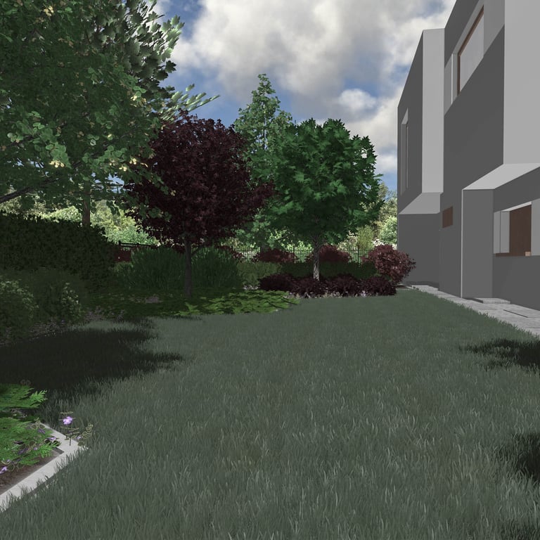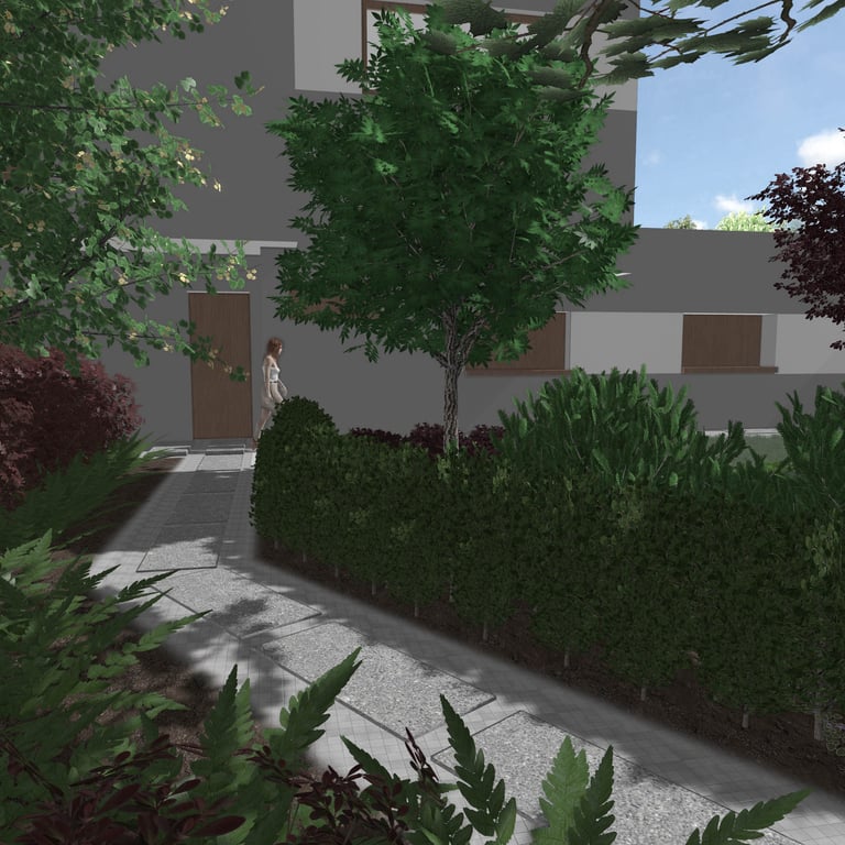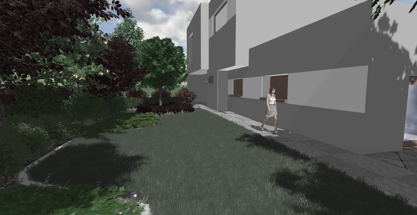 Roślinność i obrzeża wyznaczają geometryczne kształty nadając całej realizacji nowoczesnego, ale jednocześnie przytulnego wyrazu, osłaniając ją od ruchliwej drogi i wysokich budynków.