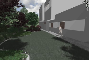 Strefa usługowa została jest położona znacznie wyżej, odgraniczając się od prywatnej murem oporowym. Ze względu na dotychczasowe zalewanie dolnej strefy oraz piwnic budynku, zostało zastosowane rozwiązanie betonowego baseniku z odpływem w miejscu niżej położonego okna piwnicznego.
