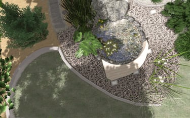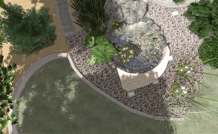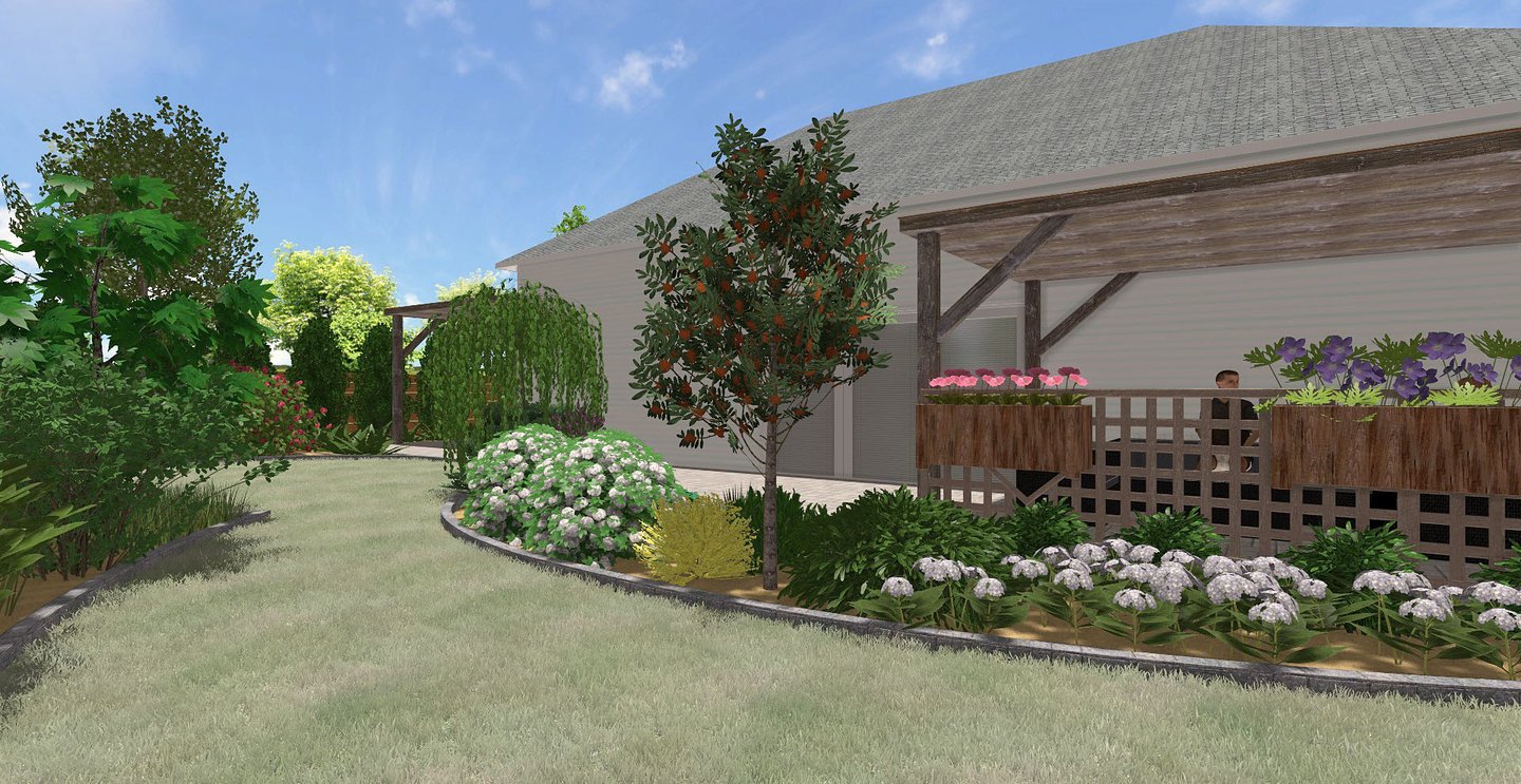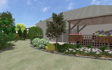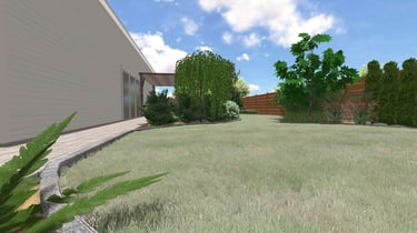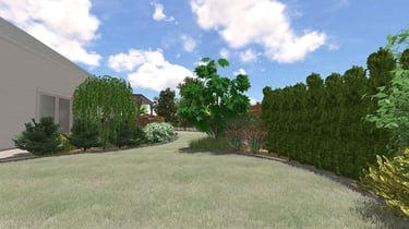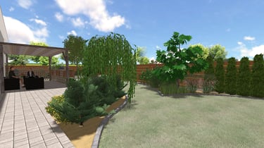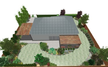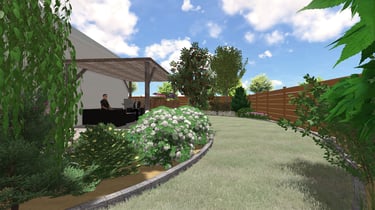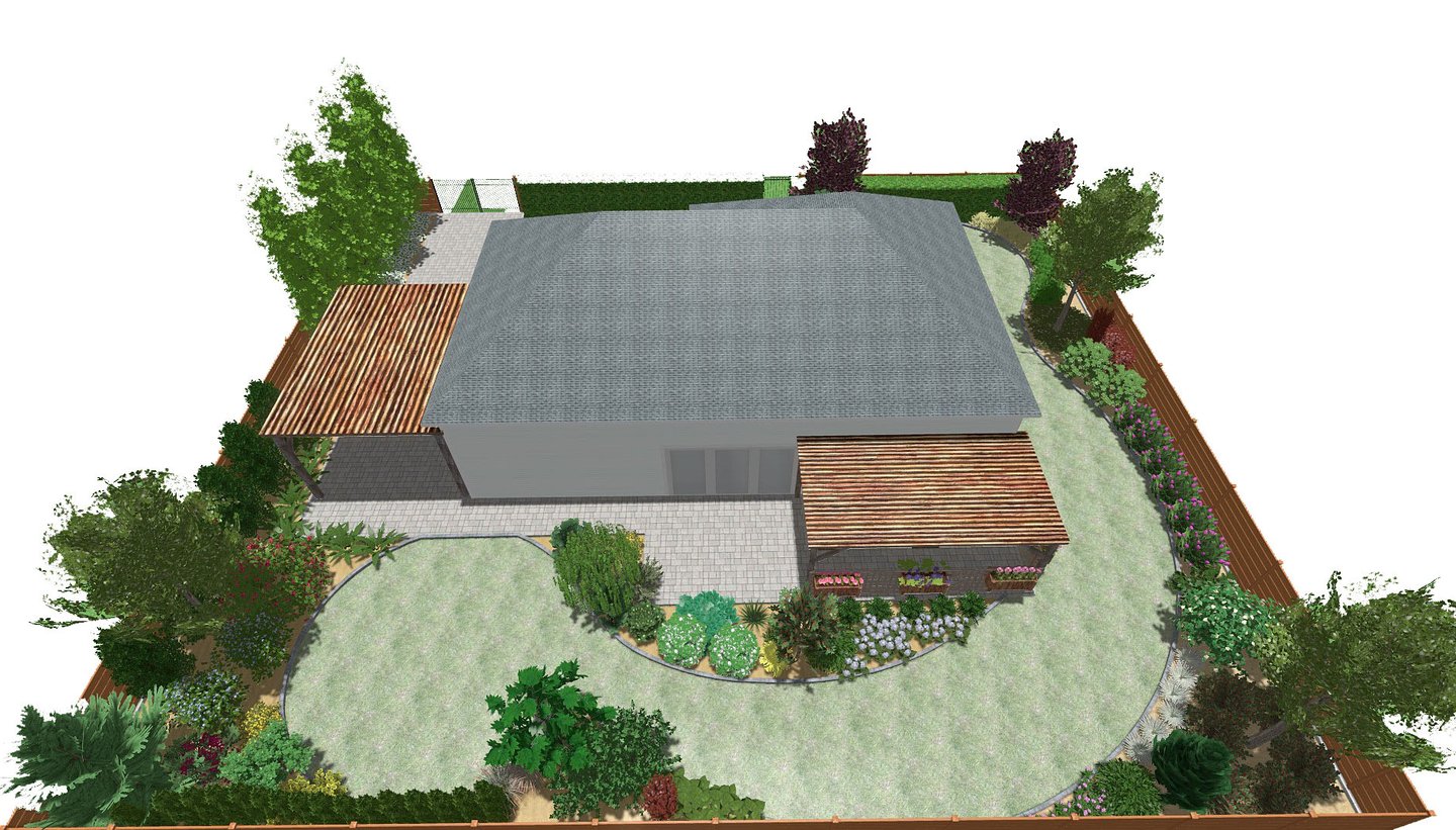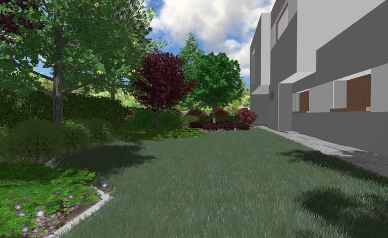 Płaska działka przy świeżo postawionym budynku. Najważniejszą wytyczną okazała się dostępność ze względu na specjalne wymagania części mieszkańców. Mocne obudowy rabat i szeroki widok z tarasu, pozwalają obserwować każdą roślinę, a ewentualne przejazdy na trawnik, nie są problemem ze względu na brak różnic wysokości między infrastrukturą a trawnikiem. Przyjemnie meandrujący trawnik wyłania się zza rabat, tworząc na małej przestrzeni sporo ciekawych perspektyw. Olbrzymi taras z pergolą całoroczną zachęca do odetchnięcia świeżym powietrzem .