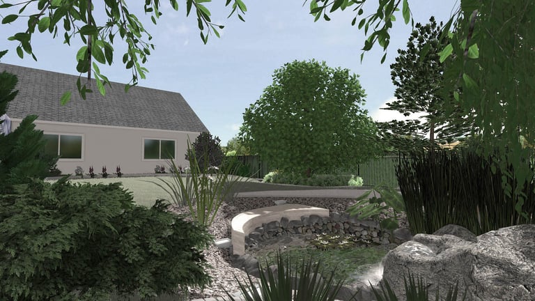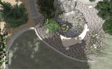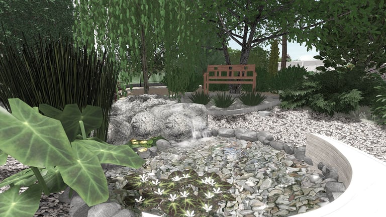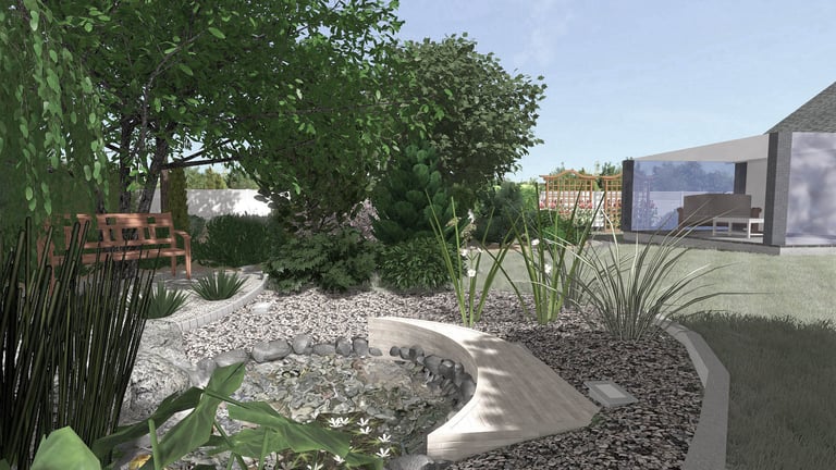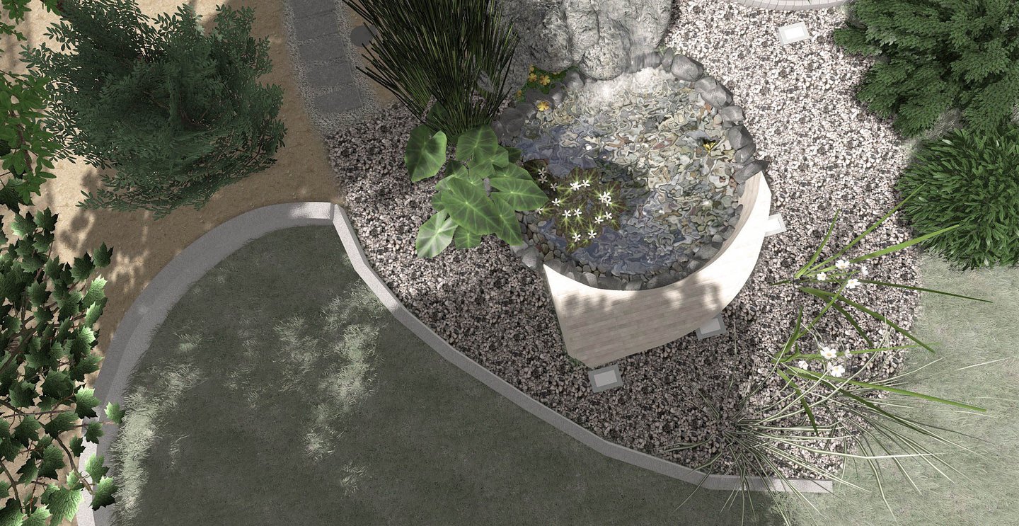 Mimo ograniczonego obszaru znalazła się tu zaciszna oddzielona od reszty ogrodu przestrzeń relaksacyjna, w otoczeniu dzikich roślin i pulsującego założenia wodnego.