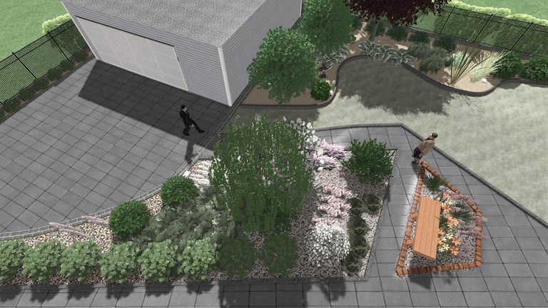 Wodne założenie będące istotnym elementem projektu, narzuciło wyspowy charakter również na frontowej części, otaczając kolorową wrzosową wysepkę infrastrukturą z płyt betonowych.
