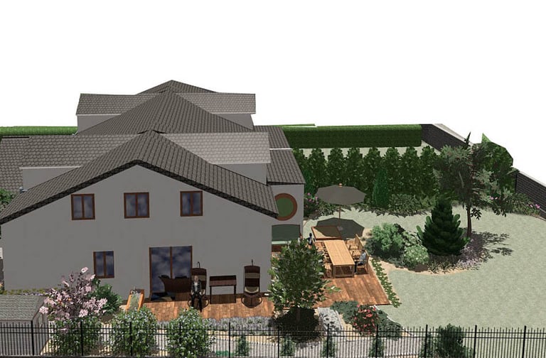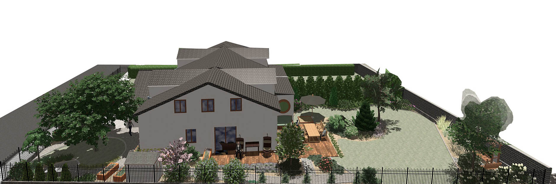 Trawnik jest wystarczająco duży aby zadowolić młodych piłkarzy, jednocześnie zachowując zaciszne miejsce na ławki ukryte w trawach dla wiecznie zaczytanego taty. Każdy znajdzie w tym ogrodzie coś dla siebie, oraz olbrzymi taras który pomieści całą rodzinę.