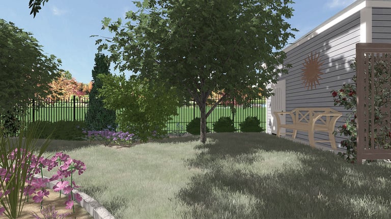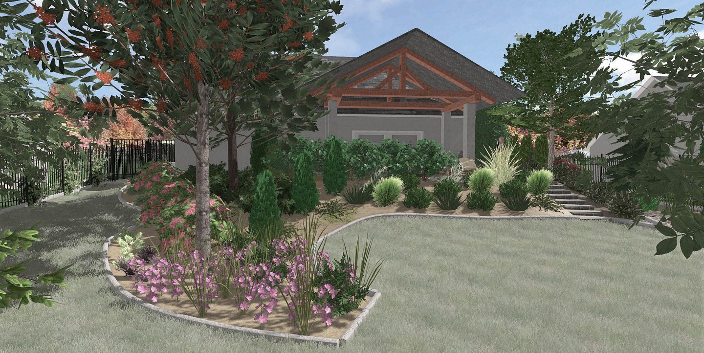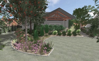 Całość zaprojektowano w wiejskim stylu i wzbogacona o skrzynie warzywne oraz drzewa owocowe na trawniku, będące jednocześnie osłonięciem działki od szerokiego pola widokowego ze względu na spadek terenu.