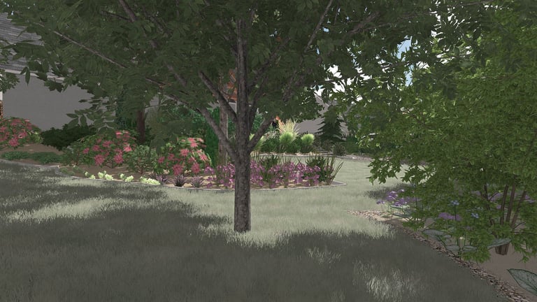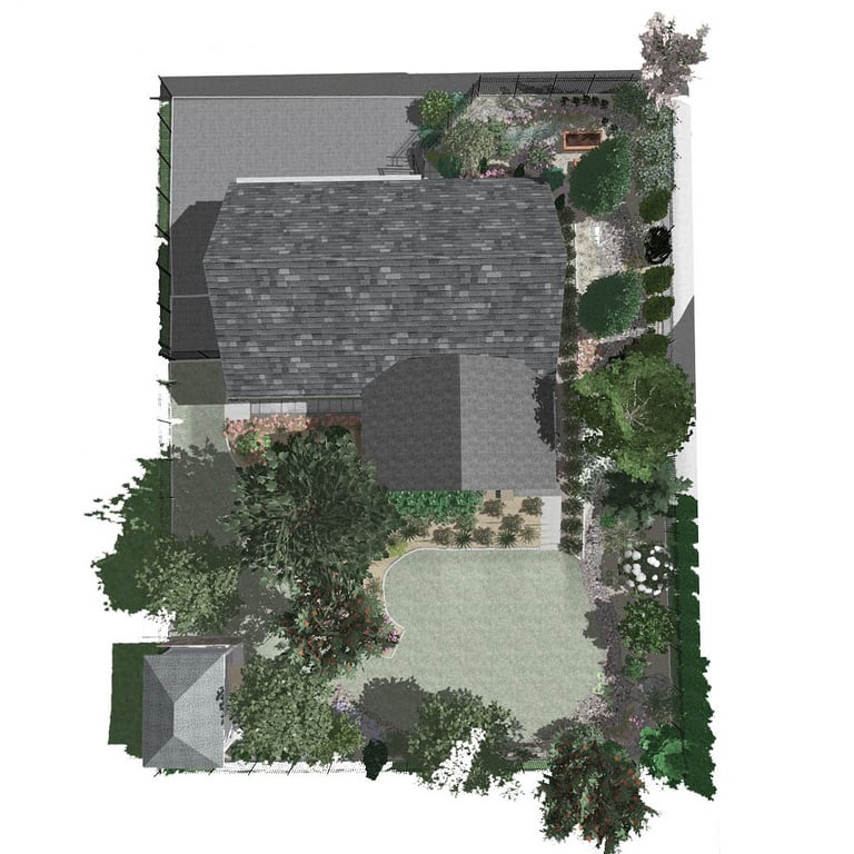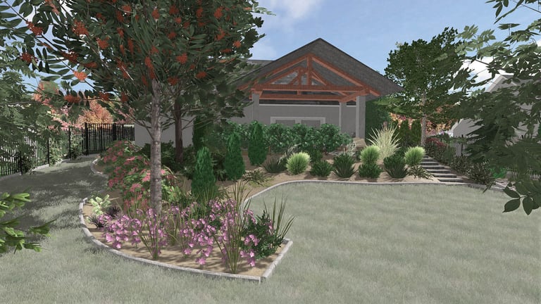 Zachodnia część działki jest wzbogacona o system połączonych ogrodów deszczowych otoczony kamieniami i roślinami odpornymi zarówno na suszę jak i długie zastoje wody.