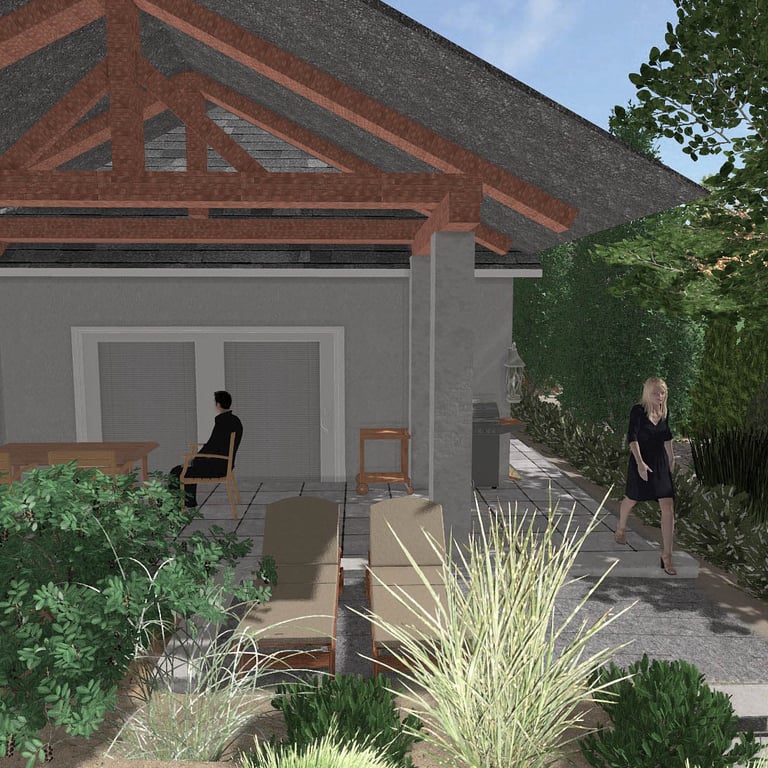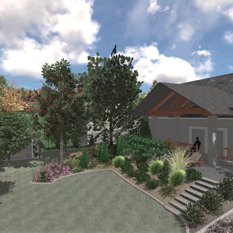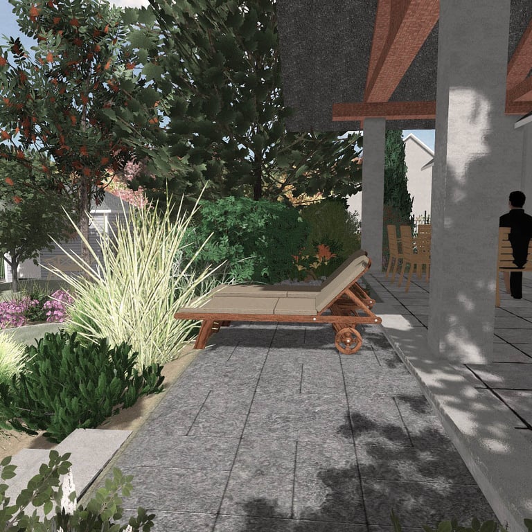 Zagospodarowanie terenu przewiduje rozbudowę istniejącej skarpy, pozwalając powiększyć przestrzeń tarasową i stworzyć przestrzeń dla roślin sucholubnych.